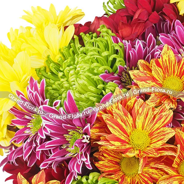 * В букете могут быть использованы хризантемы различных оттенков в некоторых вариантах цветовая гамма может отличаться от представленной на фото.