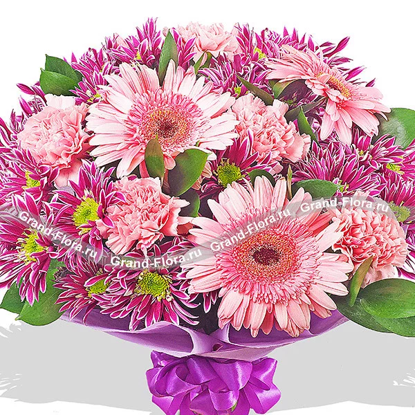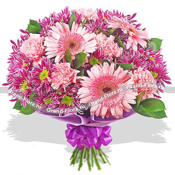 ДЕЛЮКС: гербера розовая - 9 шт., гвоздика одноголовая розовая - 14 шт., хризантема кустовая фиолетовая - 10 шт., рускус, фетр фиолетовый.