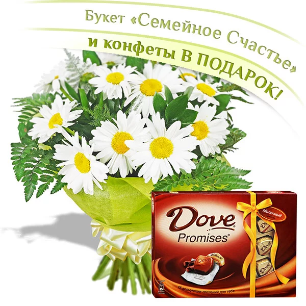 9 ромашек: ромашка белая - 9 шт, салал, триферн - 2, папоротник - 3 шт, фетр зеленый, конфеты "Dove promises".
