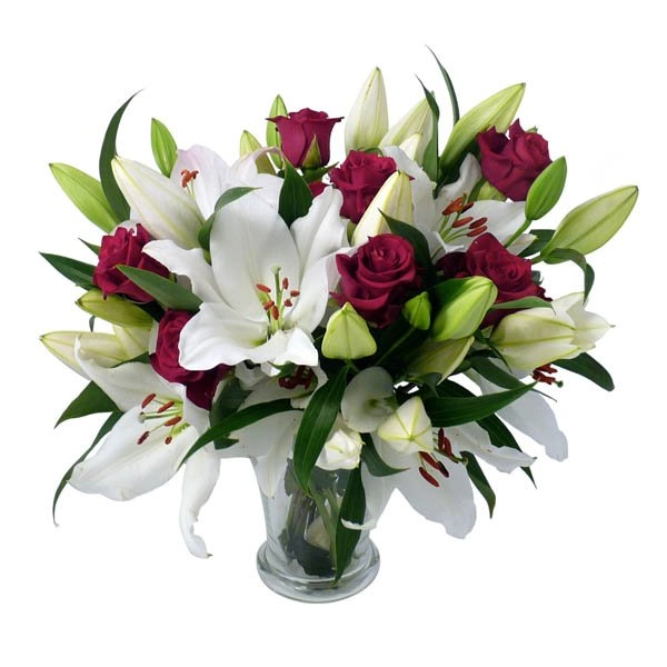 Стандартный: роза красная - 7 шт., лилия белая 4 шт., лента красная.