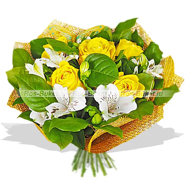 Стандартный (на фото): роза желтая - 5 шт, альстромерия белая - 3 шт, салал, натуральная упаковка коричневая, декоративная бабочка - 1 шт.