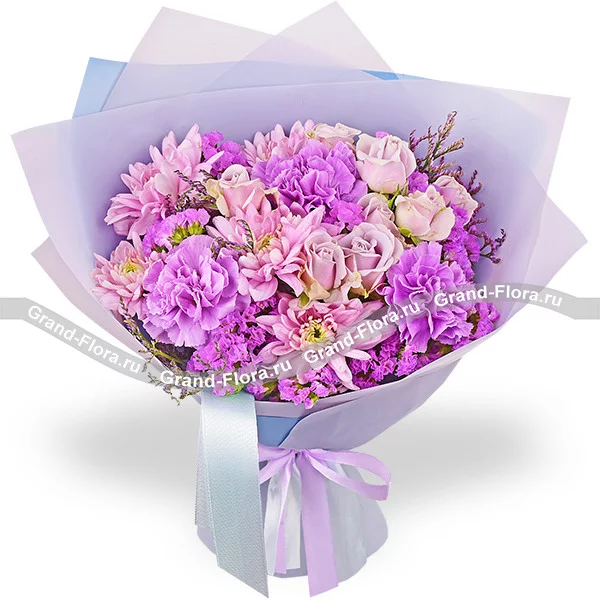 Стандартный: диантус фиолетовый - 3 шт., хризантема кустовая ромашковая фиолетовая - 2 шт., кустовая роза фиолетовая - 2 шт., статица, лимониум, упаковка, лента.